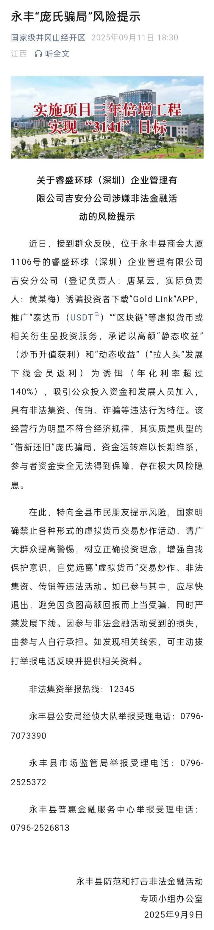〖国家级井冈山经开区9月9日,发布“睿盛环球Golden Link”非法金融违法预警〗