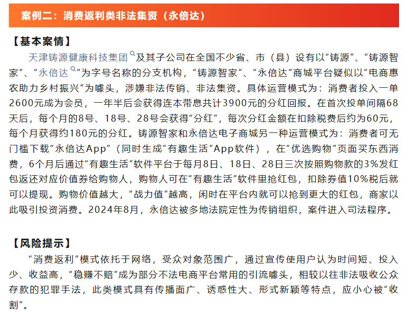 · 2025年8月,“长阳市场监管”公众号发布“防范非法集资风险提示”。文中案例提到消费返利类非法集资的“永倍达”。(点击↓图阅读全文)