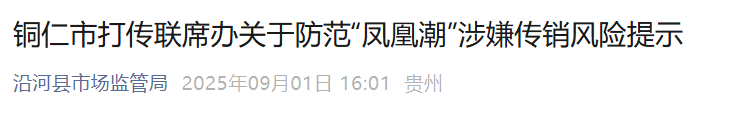 · “凤凰潮”APP:通过充值购买“会员”变相交纳入门费,以拉人头入会赚取工分的形式谋取利益,其运作模式与组织、领导传销活动高度相似。(2025年9月,贵州全省多地官方发布关于防范“凤凰潮”涉嫌传销风险提示)(点击↓图阅读全文)
