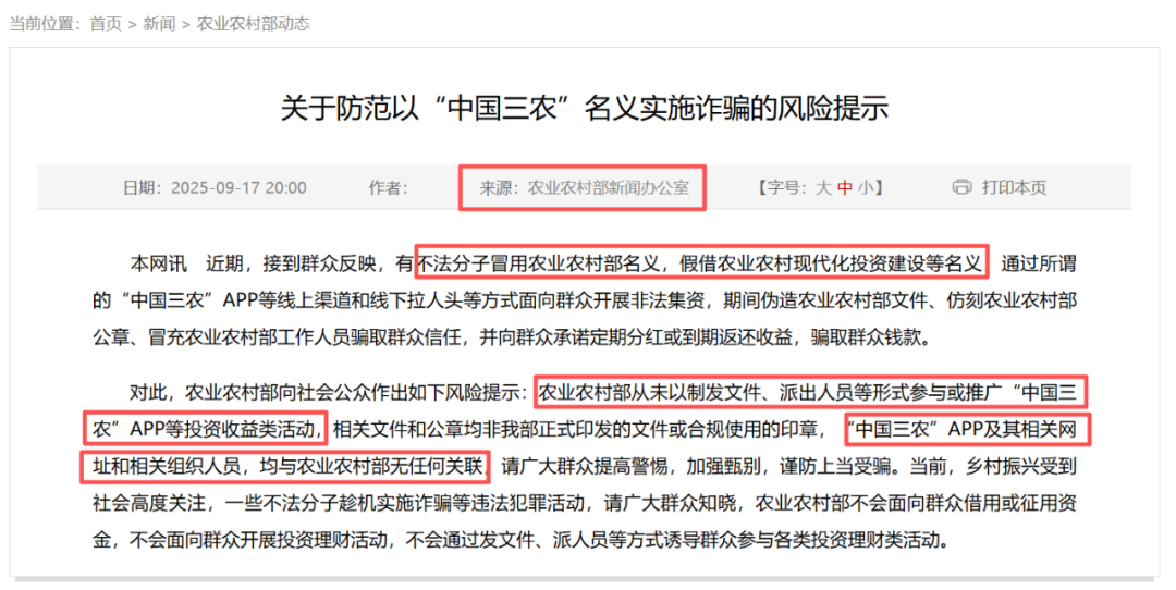 · “中国三农”APP:冒用农业农村部名义,伪造文件、仿刻公章,以农业农村现代化投资建设为名行骗。(2025年9月,农村农业部官网发布《关于防范以“中国三农”名义实施诈骗的风险提示》)