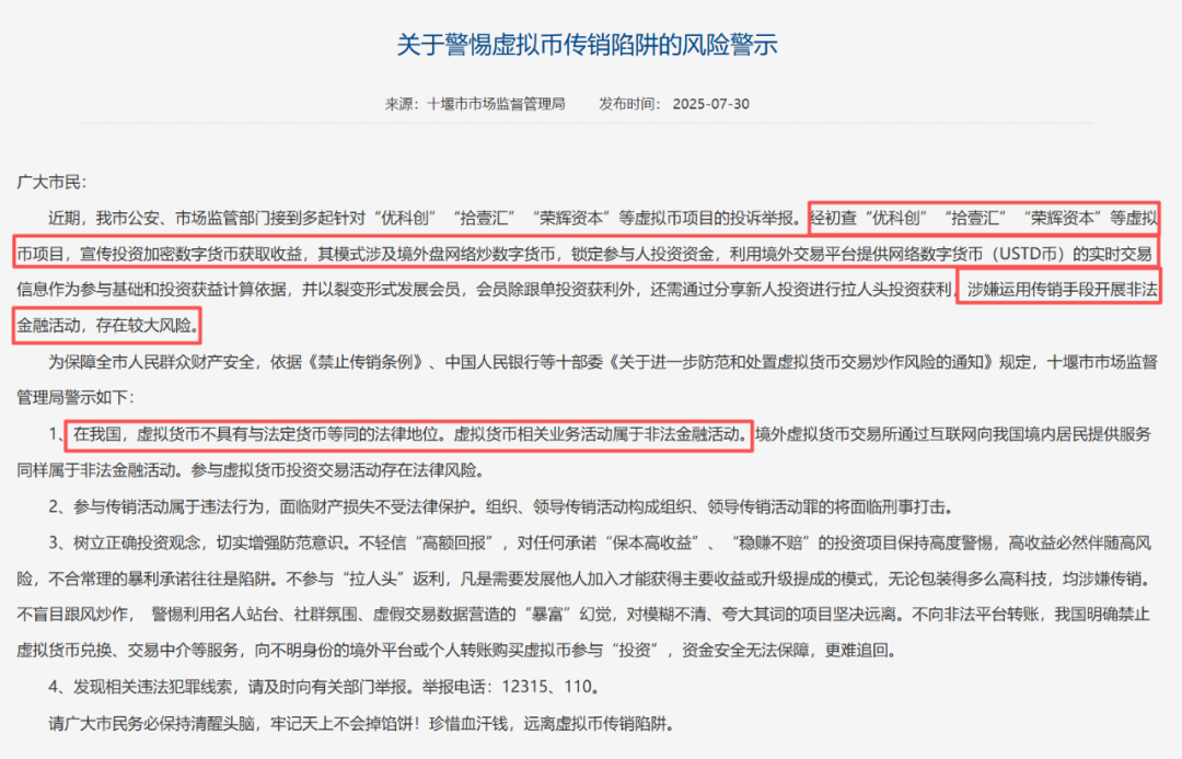 · “优科创LDC(利鼎交易所)”、“拾壹汇”、“荣辉资本”:利用境外交易平台提供USTD币交易信息,以裂变形式发展会员,涉嫌传销式非法金融活动。(2025年7月,十堰市市场监督管理局发布《关于警惕虚拟货币传销陷阱的风险警示》。)