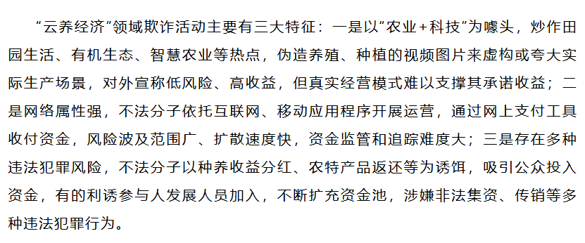 · “云养经济”骗局:以发展农业为幌子,将农产品种养包装为融资活动,虚构生产场景,以种养收益分红为诱饵,吸引公众投入资金,并利诱发展下线。(2025年1月,四部门联合发布《关于进一步防范“云养经济”领域欺诈风险的提示。》)(点击↓图阅读全文)