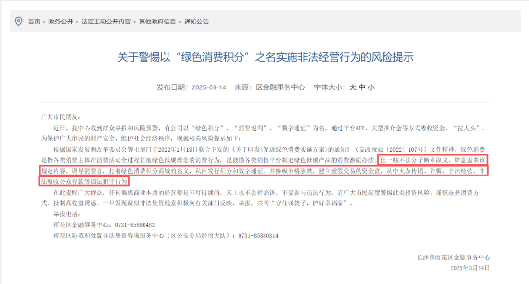 · “绿色消费积分”骗局:有公司对官方政策断章取义,私自发行积分和数字通证,操纵价格,建立虚假交易资金盘,夹杂传销、非法集资等行为。(2025年3月,长沙市雨花区金融事务中心发布《关于警惕以“绿色消费积分”之名实施非法经营行为的风险提示》)