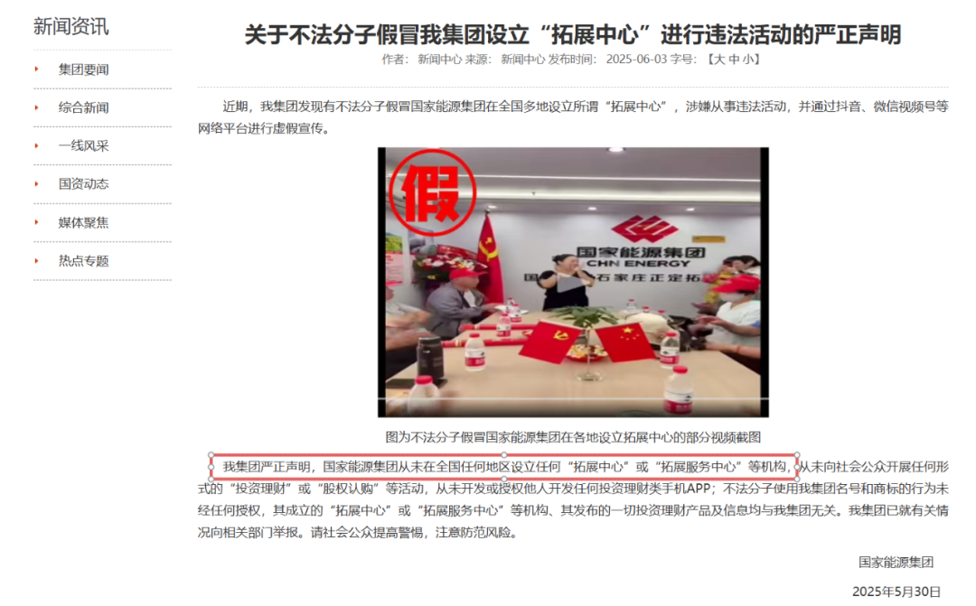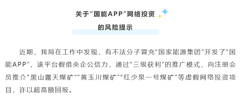 · “国能APP”:不法分子冒充“国家能源集团”开发“国能APP”:,虚构煤矿投资项目,以“三级获利”模式发展会员。其发布的一切活动和产品均与国家能源集团无关。(2025年6月,“缙云公安”公众号发布《关于“国能APP”网络投资的风险提示》)(点击↓图阅读全文)