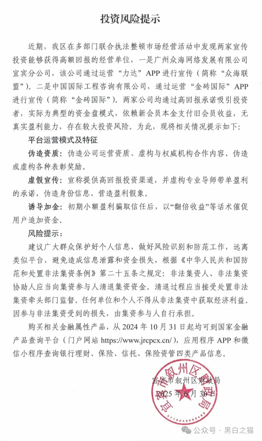· “力达”APP:通过高回报承诺吸引投资,实为依靠新会员本金支付旧会员收益的典型资金盘。(2025年6月,宜宾市叙州区财政局发布关于“金砖国际”APP、“力达”APP两个项目投资的风险提示。)