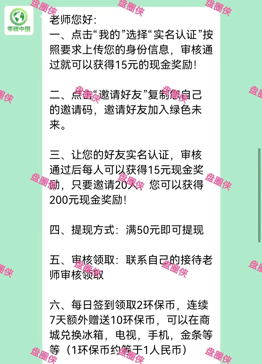 绿色未来:最近上线预热的以绿色低碳为噱头的资金盘项目骗局。注册实名认证送15元,要求上传身份证正反面和录制一个手持身份证正面的视频,每日签到赠送2环保币,连续签到7天额外赠送10环保币,环保币可在商城兑换商品(1环保币等于1人民币)。