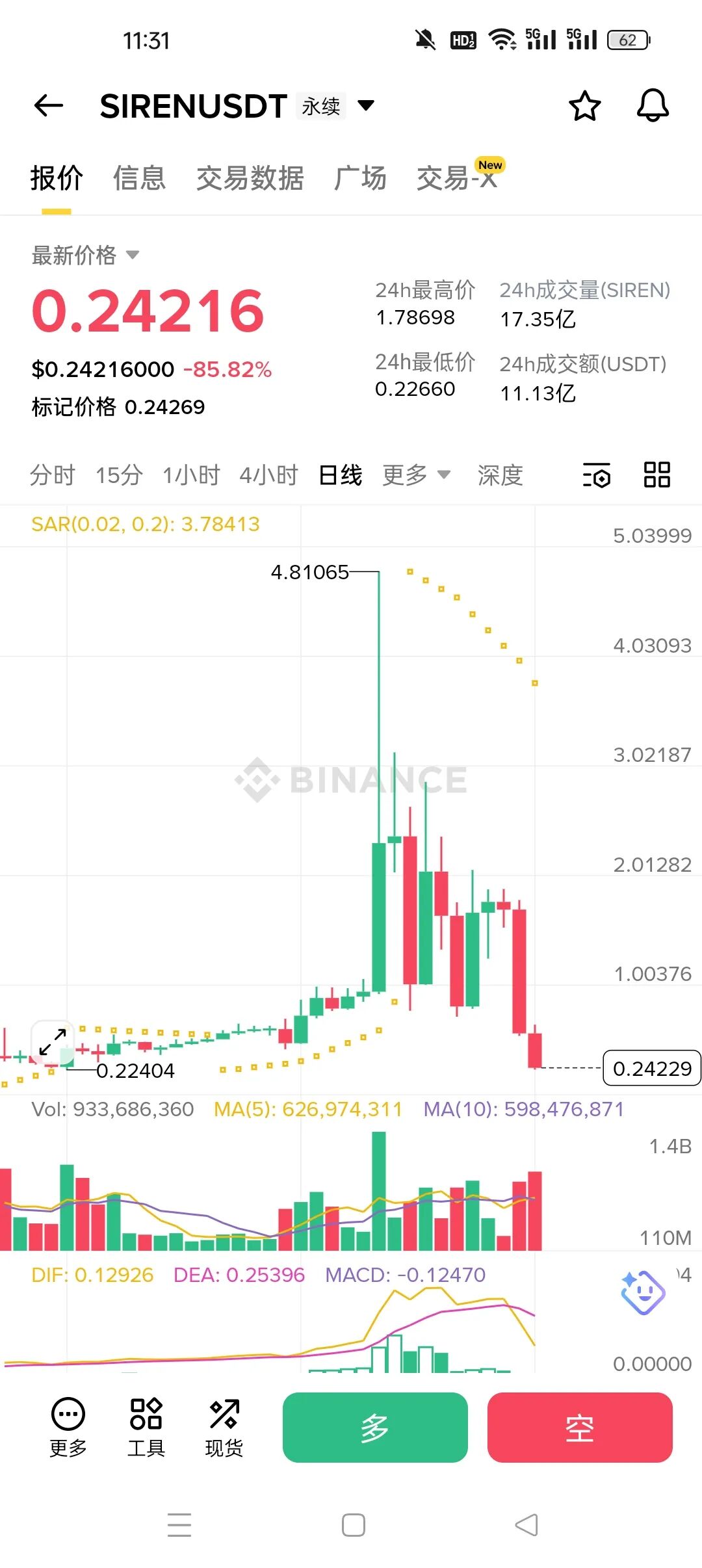 24小时数据:24小时内最高价1.78698美元,最低价0.22660美元,振幅超过600%;成交量高达17.35亿枚SIREN,成交额11.13亿USDT,说明无数散户在暴跌中疯狂割肉,而庄家早已在高点完成出货。