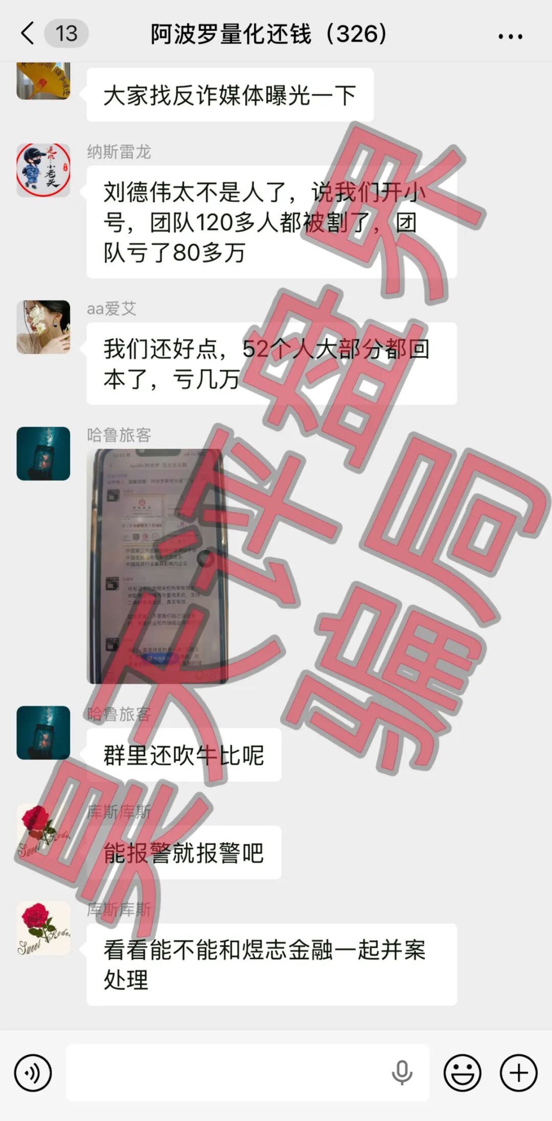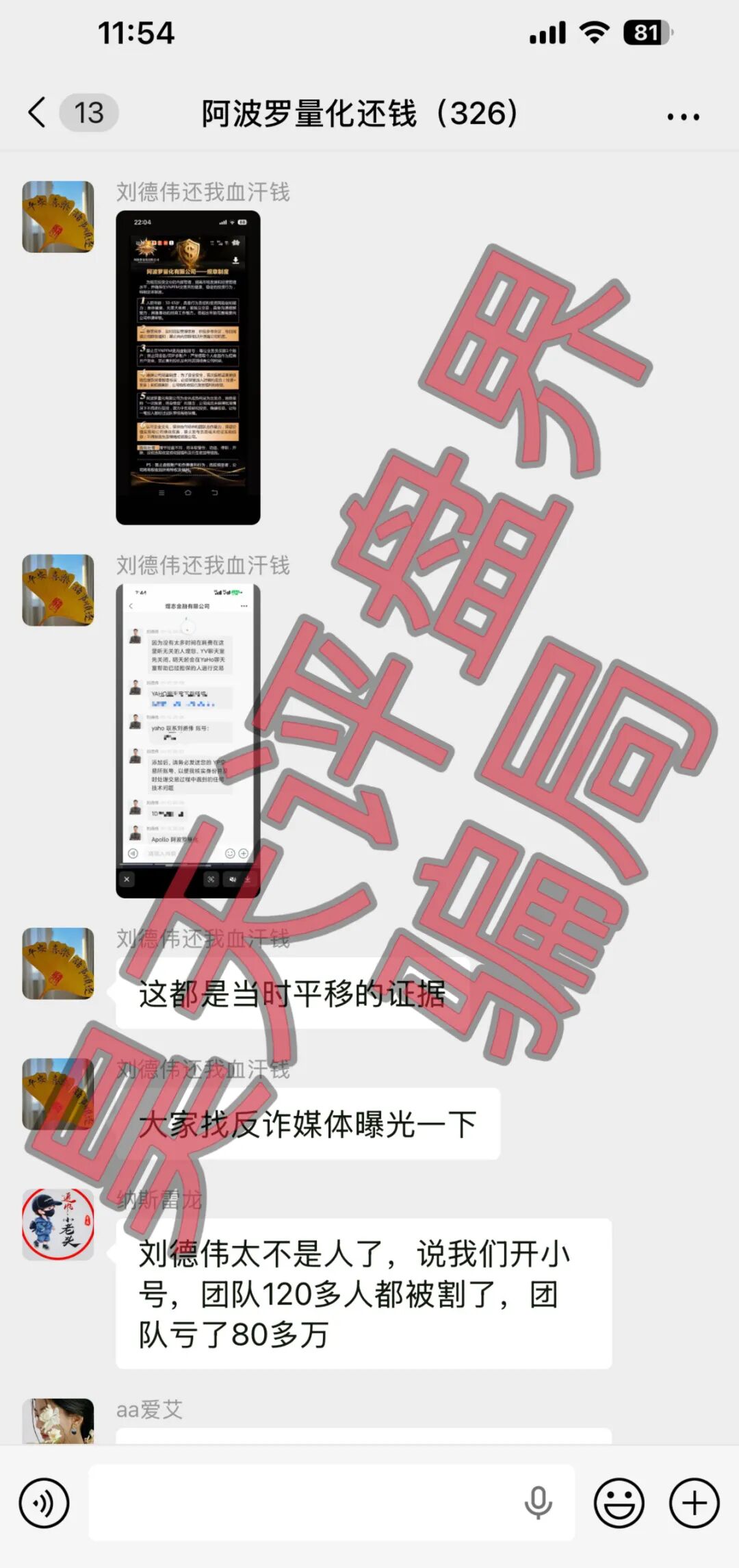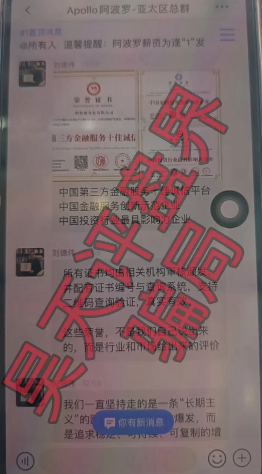 昊天评盘界:阿波罗量化资金盘骗局昊天之前预警过2次,此盘是当时“煜志金融”的平移重启盘,模式就不重复曝光了,合约带单类资金盘骗局,操盘手刘德伟是一直在单割会员,上个月割了2次,这个月前天又单割了500多人,据受害者反馈不少人已经选择报警,此盘已经被调查中,高度预警,即将崩盘跑路,直接上单割的证据: