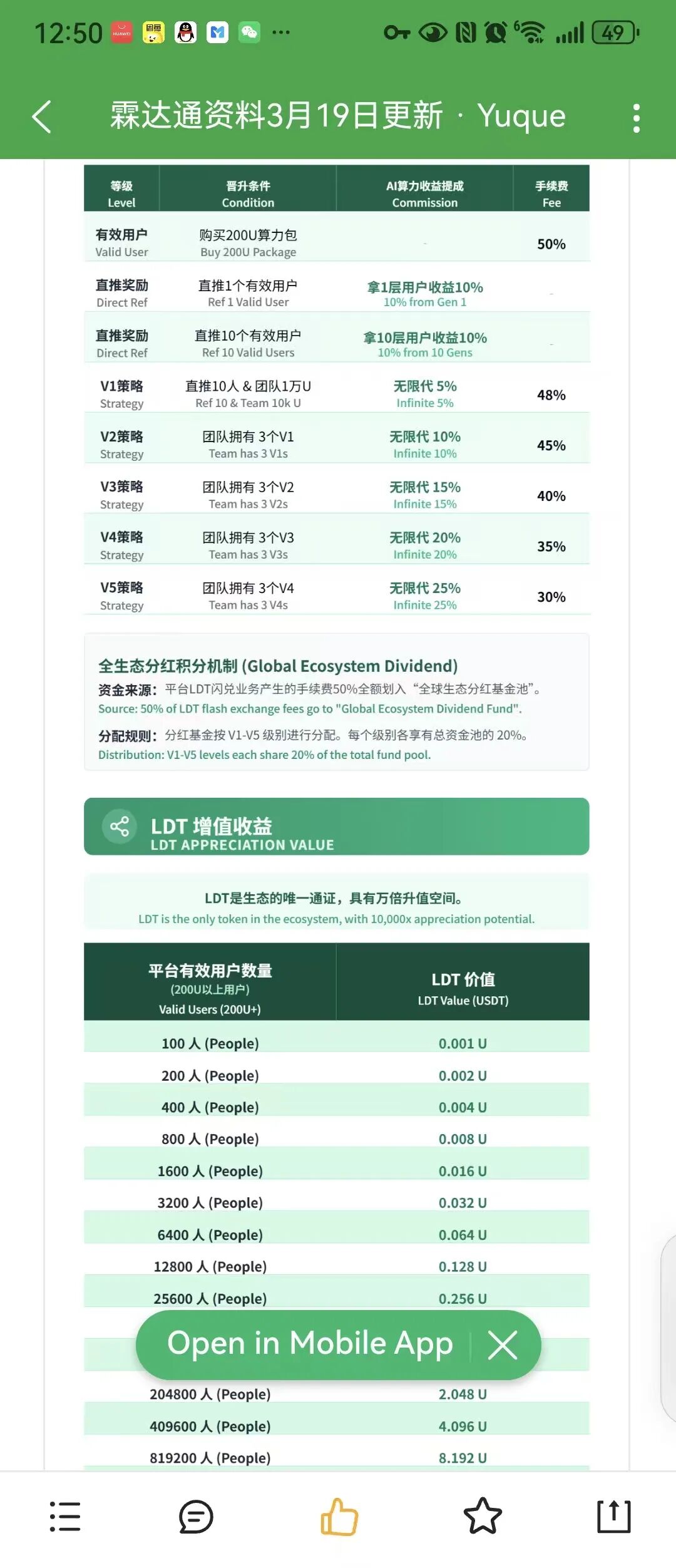 霖达通最会画饼的,就是所谓的「LDT增值收益」:宣称LDT是生态唯一通证,有万倍升值空间,用户数量翻倍,币价就翻倍,从0.001U涨到8.192U,只需要用户数到819200人。