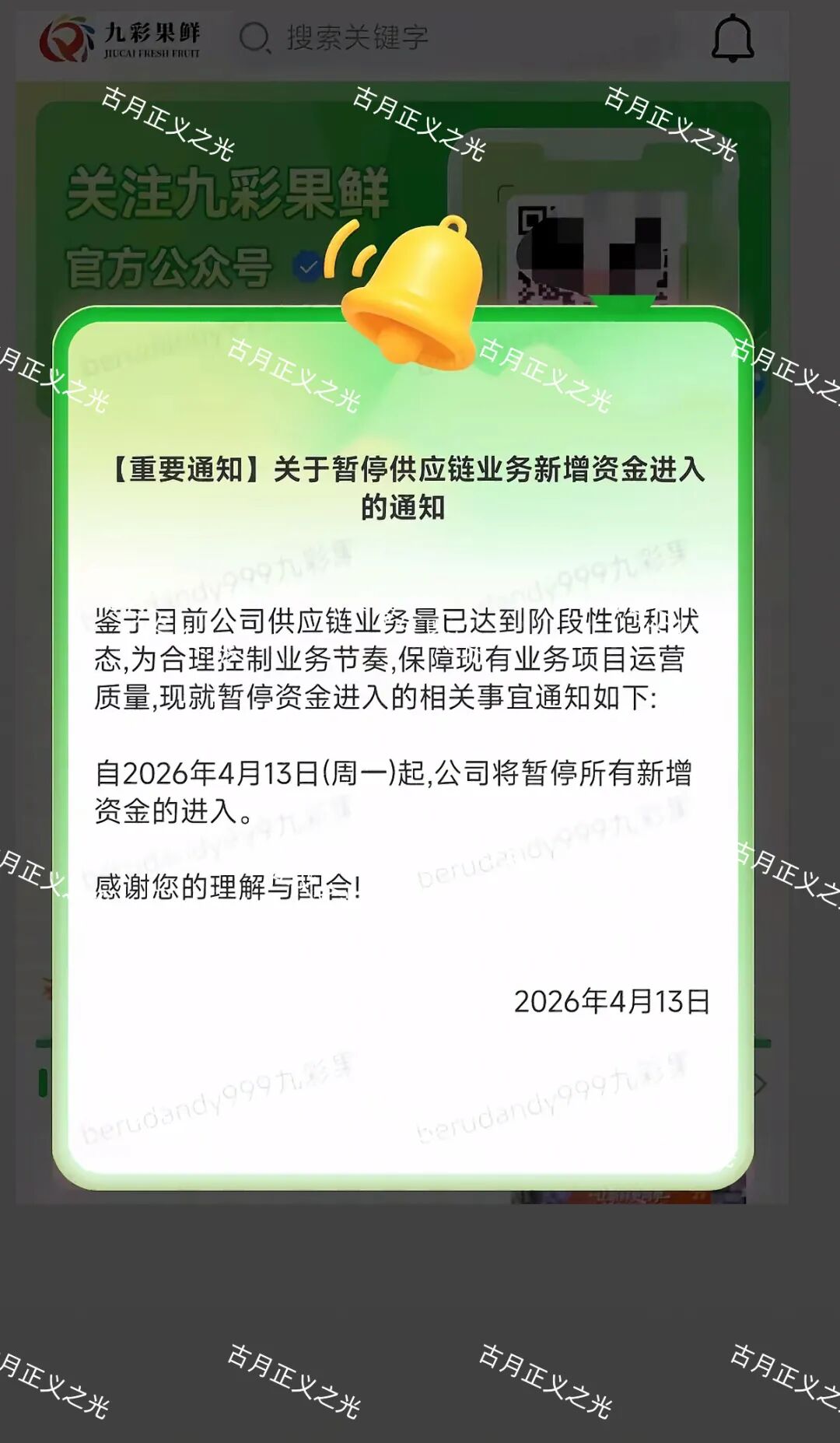 指出真相的人,会变成傻子和骗子的共同敌人,大家好,我是古月,九彩果鲜水果拼车今日发布公告:暂停新增资金进入,你安全撤离了吗?带大家来看看最新公告:【重要通知】关于暂停供应链业务新增资金进入的通知鉴于目前公司供应链业务量已达到阶段性饱和状态,为合理控制业务节奏,保障现有业务项目运营质量,现就暂停资金进入的相关事宜通知如下:自2026年4月13日(周一)起,公司将暂停所有新增资金的进入。2026年4月13日