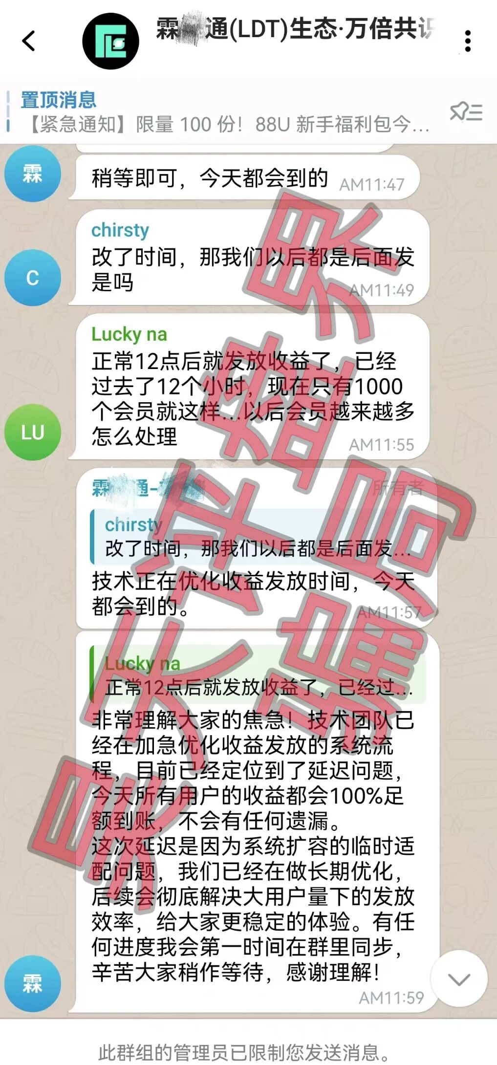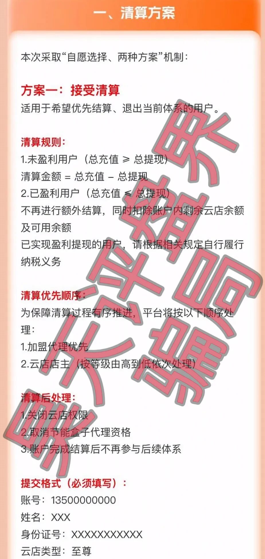 这个盘之前昊天曝光和预警了很多次,最新消息:现已多馆交易崩盘,明面上的操盘手老王各种甩锅,会员资金被转为券和酒,平台以清算、重启方案进行二次收割,提现困难、幕后操盘手也肯定不是老王,他们软着路的退路早就准备好了,昊天告诉你们此盘能维权成功的几率微乎其微,最后的结果最多是明面上的操盘手老王和部分馆主,部分董事判刑进去,想要回血汗钱很难…