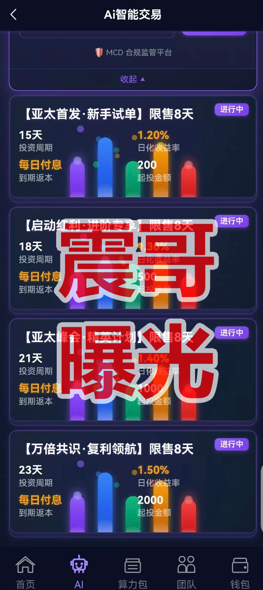 它的产品分几档:新手试单15天,日化1.2%,200U起投;进阶专享18天,日化1.3%;精英计划21天,日化1.4%;复利领航23天,日化1.5%。算一下,年化最高547.5%。投10万,一年变64万。我问你,真有这好事,操盘手自己拿100万投进去,三年就是亿万富翁,他为什么要分给你?你也不是他爹。所有承诺“固定高息、到期返本”的项目,100%是庞氏骗局。收益不是AI量化赚的,是用后面新人的钱付前面老人的利息。新人一断,资金链立刻断,平台直接跑路。