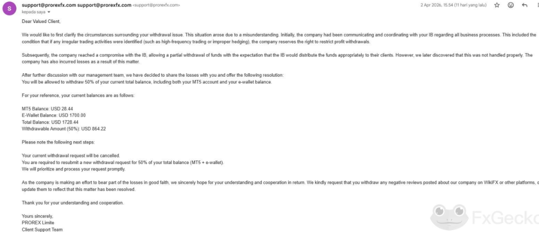 B某表示,自己也是在该平台遇到出金问题,我的账户资金1,728.44美元,提现未到账,客服要求我删除第三方媒体的投诉,就给我50%的退款(864.22美元)。我履行了承诺删除帖子后,客服就不回复信息了。B某希望平台归还其资金,并提醒投资者注意该平台。