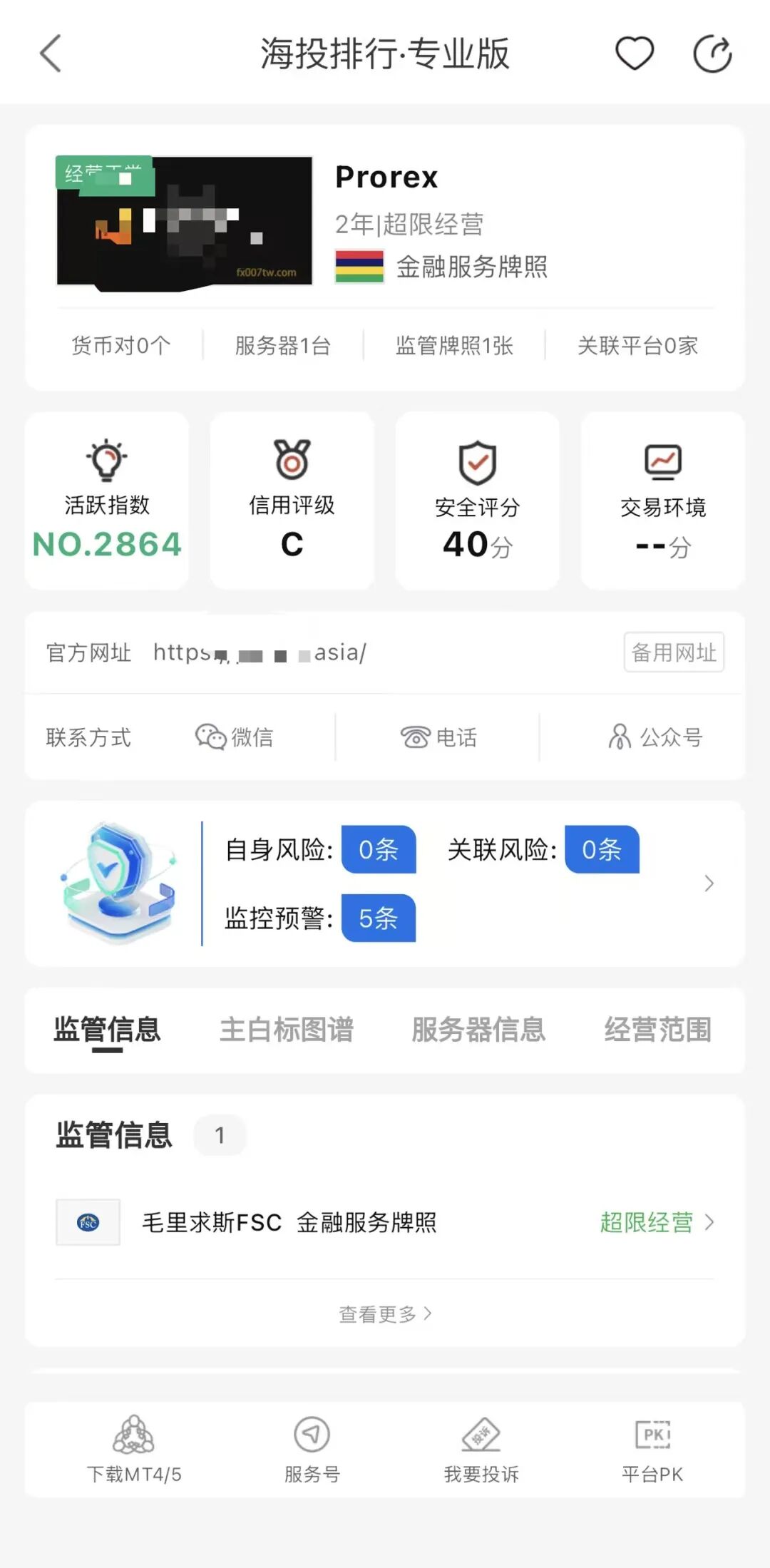 我也特意看了一下第三方软件“海投”的数据,Prorex平台目前排名2864,成立2年,手里拿着1个金融监管牌照。当然,评分数据只是仅供参考。