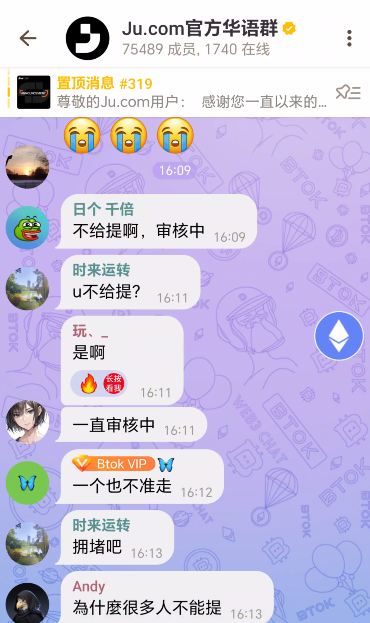4月13日下午15:55,JU币毫无征兆瞬间砸盘,从2.7889U直接砸到2.2395U,随后又将币价拉起,币价拉起后,不少人发现自己无法提现了。