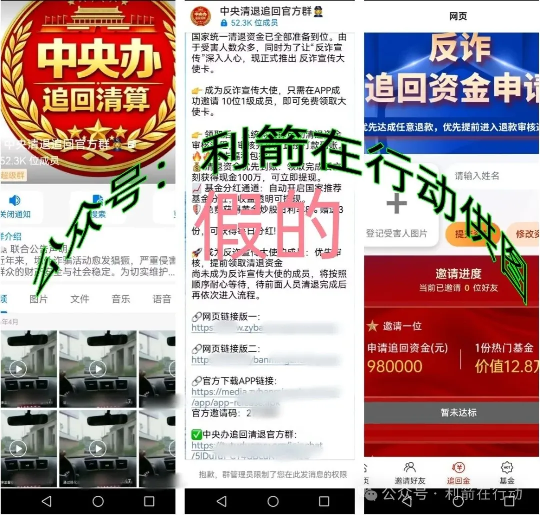 近期网络中上线了追回清算APP(又名“中央办清退追回”APP),该项目宣传“注册就送30万元,邀请人注册申请追回98万元,给价值12.8万元的热门基金,邀请3人注册,申请追回168万元资金,送价值12.8万元热门基金………….”