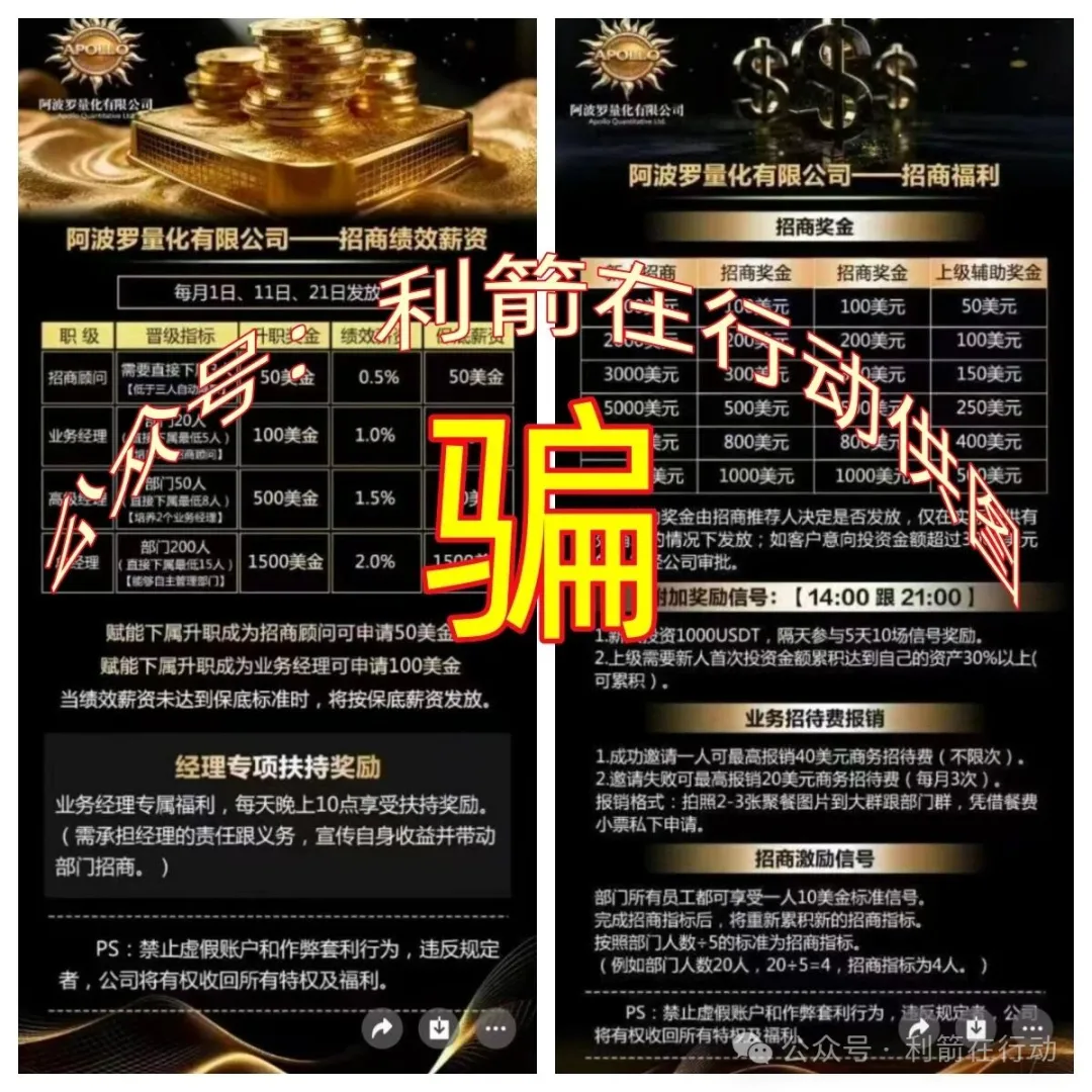 接到被骗人讲述:阿波罗量化合约跟单,4.13日凌晨单割了聚鑫团队,金汇团队,聚运团队,金悦团队,这4个团队总共4000多人,涉及金额大概3000多万元,还有顶汇团队,星光团队,也被单割了,凌晨之后直接账号登不上去,密码错误,后面还在陆续续续的单割。