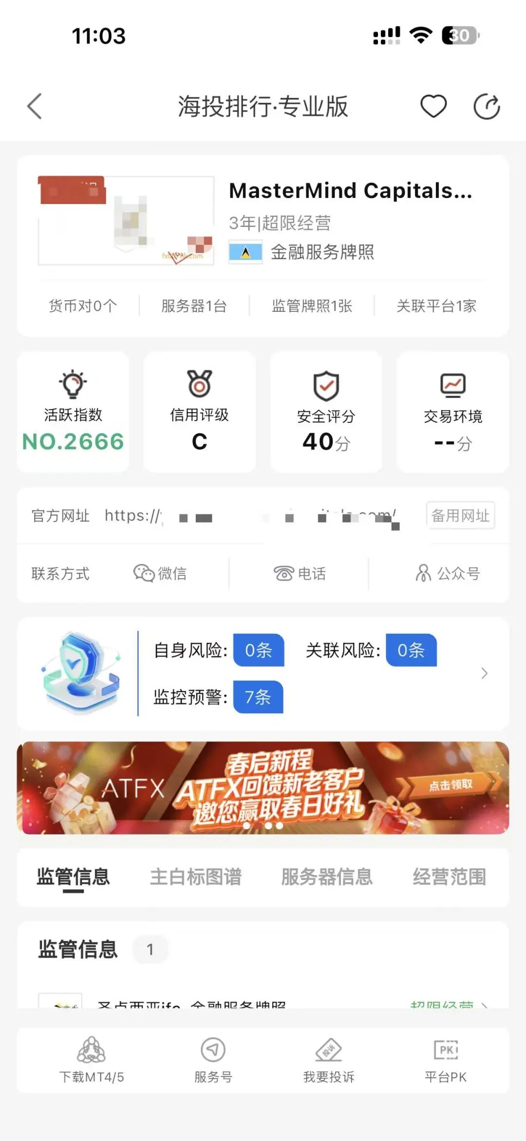 我也特意看了一下第三方软件“海投”的数据,MasterMind Capitls平台目前排名2666,成立3年,手里拿着1个金融监管牌照。当然,评分数据只是仅供参考。