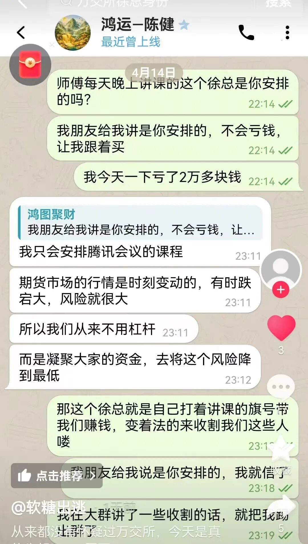 先给大家说个事:有位会员跟着“鸿运-陈健”的万交所社群,听“徐总”讲课带单,投了钱做10倍杠杆的期货,结果一天就亏了2万多。找老师讨说法,老师直接甩锅“我没安排徐总”,在群里说两句被收割,直接被踢出群,账户里的钱说没就没,哭都没地方哭。