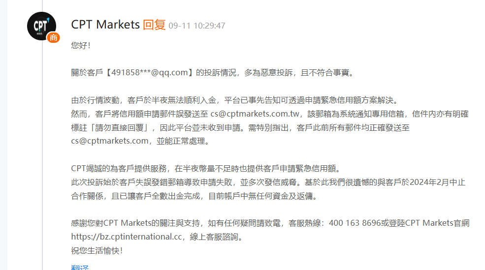 针对这一投诉,斑马投诉已将信息反馈给CPT平台。平台方回复如下:“由于行情波动,客户于半夜无法顺利入金,平台已事先告知可通过申请紧急信用额方案解决。此次投诉始于客户失误发错邮箱导致申请失败,并多次发信威胁。基于此我们很遗憾的与客户于2024年2月中止合作关系,且已让客户全数出金完成,目前账户中无任何资金及返佣。经核实,该客户账户内的资金已于2023.11.1全数强制打款至客户银行卡内。”
