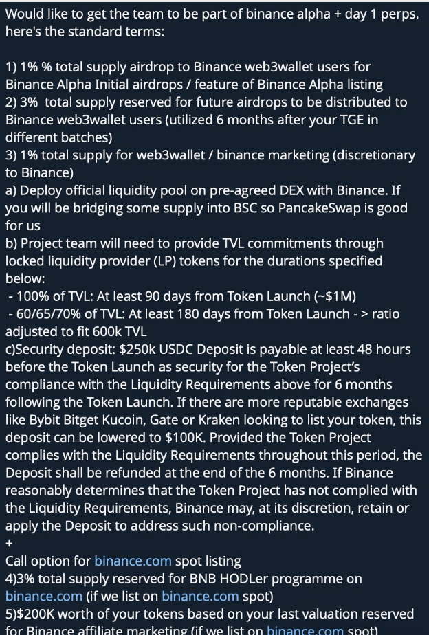 如果你想上币安的 Alpha 和永续合约:得交出 5% 的代币总供应量,外加约 125 万美元的投入(其中25万是保证金)。具体包括: