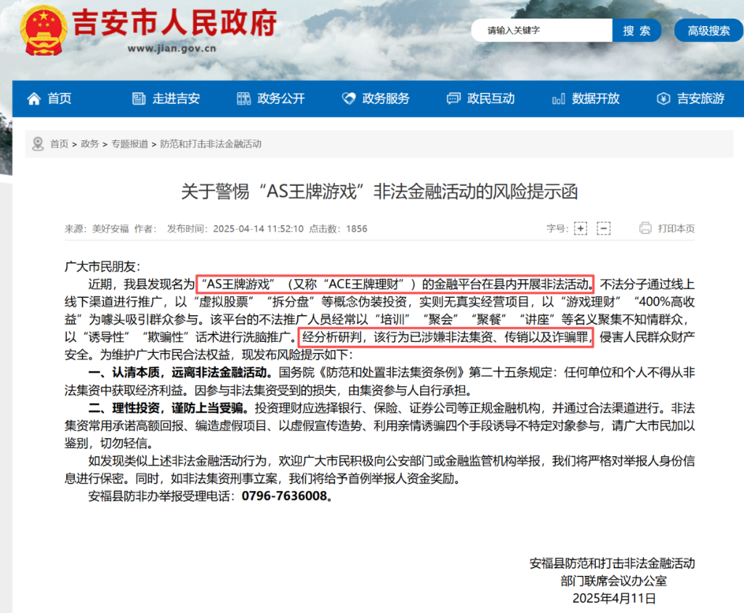 · “AS王牌游戏”:以“虚拟股票”“拆分盘”等概念伪装投资,通过“培训”“讲座”等形式洗脑推广,该行为涉嫌非法集资、传销及诈骗。(2025年4月,吉安市安福县打非办发布《关于警惕“AS王牌游戏”非法金融活动的风险提示》)