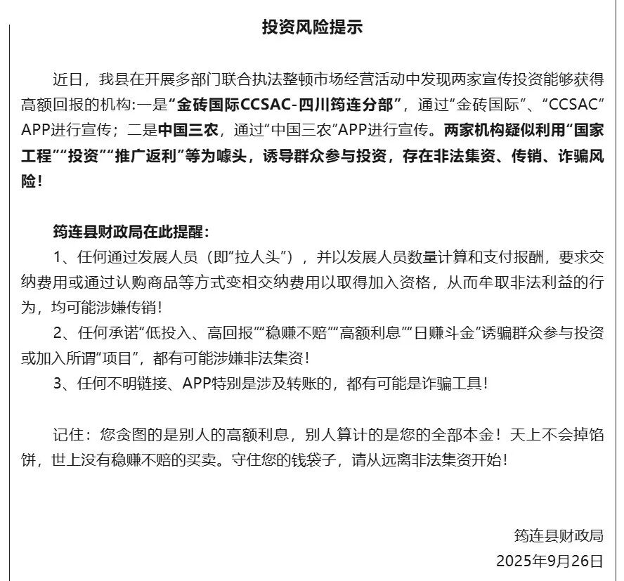 · “金砖国际”APP、“CCSAC”APP:利用“国家工程”“投资返利”为噱头诱导投资。(2025年9月,筠连县财政局发布风险提示)