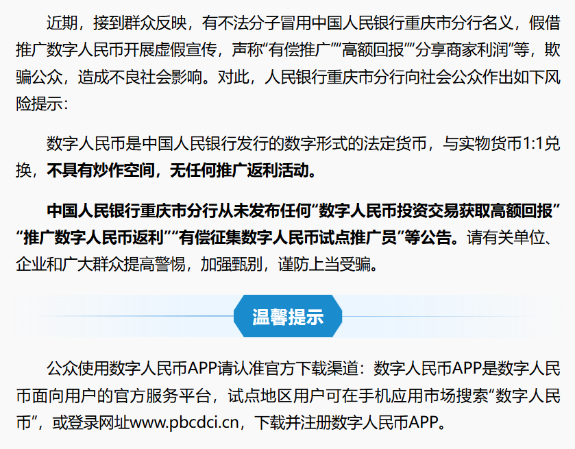 · 2025年9月,“人民银行重庆分行”公众号发布《关于防范“数字人民币投资返现、有偿推广”等新型诈骗的风险提示》。风险提示中明确提到:数字人民币不具有炒作空间,无任何推广返利活动。警惕“数字人民币投资获取高额回报”、“有偿推广员”等骗局。(点击↓图阅读全文)