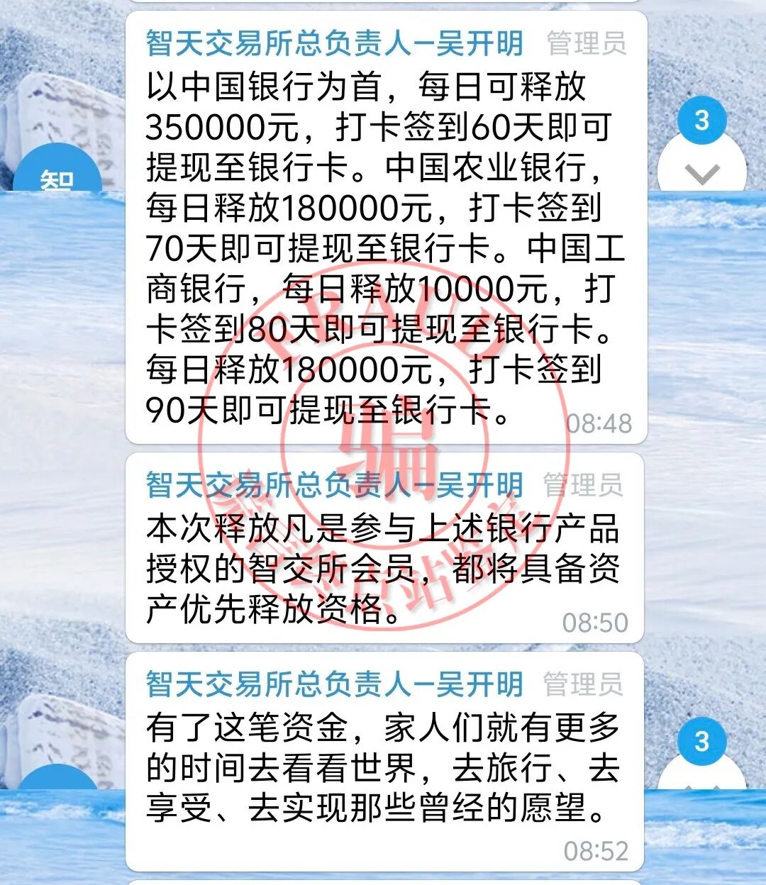 这一骗局以释放资产的名义,推出名目繁多的“虚假投资产品”。智天环球币,智天所礼包,智天扶持计划,百亿计划,造富计划,智天专享救助金,不良资产等等。收益高得吓人,一开始给你点甜头,等到高额收益兑现的日子,就是第三次关网的日子。