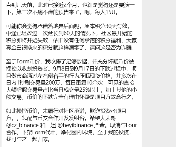 大概的意思就是four平台推出了相关的积分活动,然后明里暗里的暗示大家多多持有Form这个币,结果活动结束奖励没有,币价格还跌了80%,这其实就是韩新的明修栈道暗度陈仓,明面上给大家希望,发布各种利好,各种活动,然后等大家都进场之后,以迅而不及掩耳盗铃的出货速度,把市场的流动性吃干抹净,随后就不管不顾。