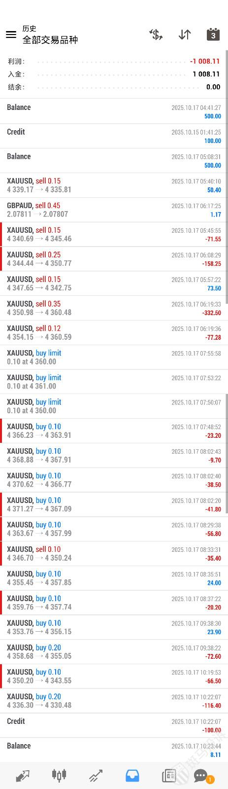 A某称,入金后,该代理以可以代为操作、保证盈利为由,让其在2025年10月17日再次充值1000美金。然而事实是,入金仅几个小时,账户资金就出现了较大亏损。在与陈某沟通中,对方表示是其“老大”做单约1小时导致亏损500美金,随后他自己接手操作,在下午将剩余的500美金也操作至全部损失。