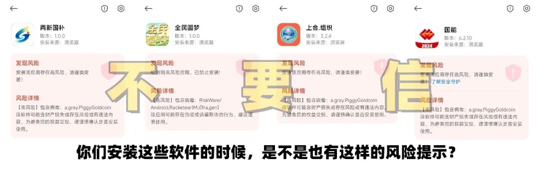 需要特别强调的是,这些涉诈APP没有任何备案,均出自境外!不能通过官方应用商城下载,且下载时,都会有风险提示。