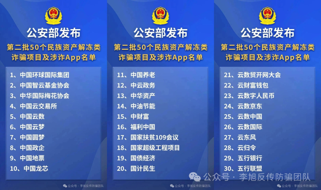 · 2024年,官方部署打击“民族资产解冻类”诈骗犯罪,并分批公布了上百个涉诈项目及App名单;