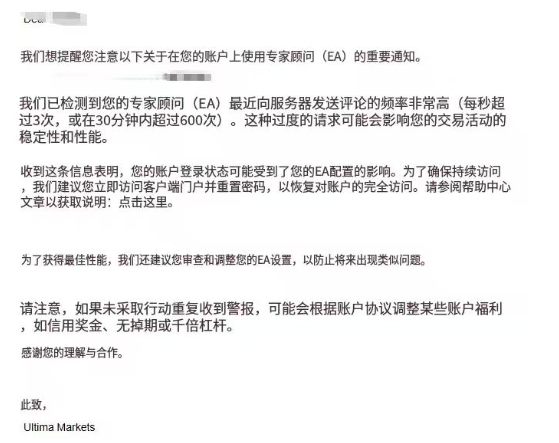 A某表示,自己是该平台的交易者,交易账户为19610931。在交易过程中,他收到了平台MT4系统发送的邮件提示,内容显示“一秒超过3次指令的单子”会被系统监控。邮件解释称,此类操作可能导致服务器超载。用户A某认为,根据行情变化快速执行策略是交易中的常见操作。