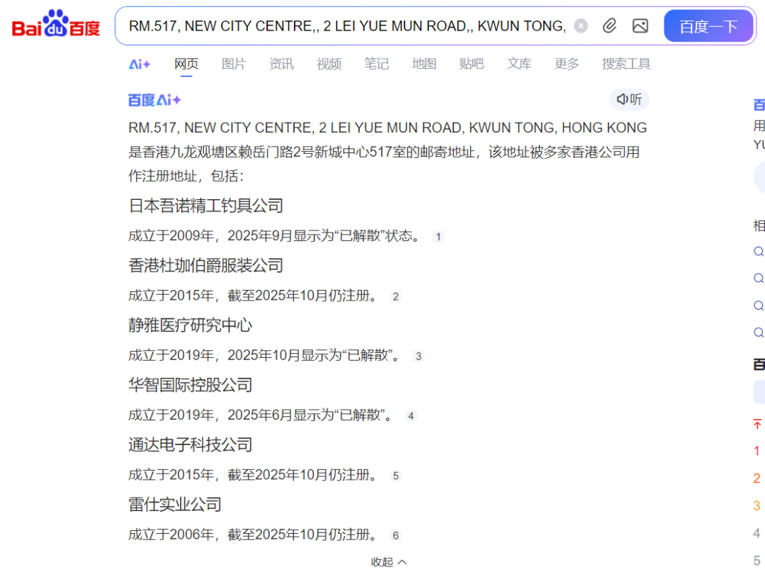下面是小诺在天眼查中分别查询了“新晃德懋”、“怀化德懋”、“香港德懋控股”三家公司相关情况截图。不难看出新晃和怀化公司的实际控制人都是一个人。而小诺在通过百度搜索这家港资公司的办公地点,更是令人感到疑惑。同一个门牌地址注册了好几家公司,并且已经有多家公司处于解散状态了。我相信各位网友也做过生意,租过写字楼,同一楼层,会有不同隔间租给不同的租户,但是物业会给每一个隔间设立有单独的编号,是为了方便物业管理以及租户收发快递和信件的。我们看到这么多业主租在写字楼同一层的一个办公室里,难免不让人怀疑这是一家皮包公司。
