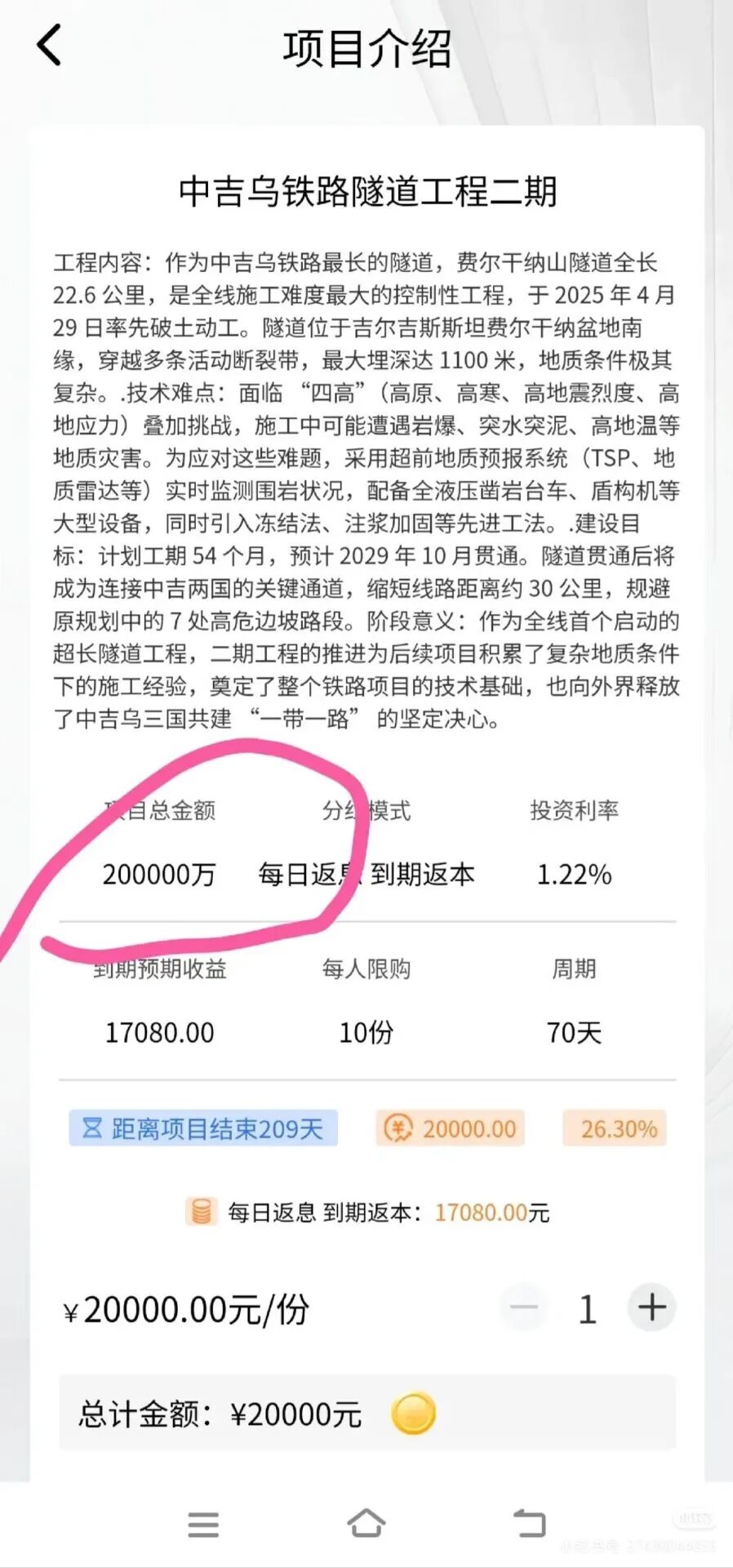 更值得警惕的是,APP内赫然上线了所谓“中吉乌铁路隧道工程”二期、三期等投资产品。但事实是:中吉乌铁路项目直到2025年4月才正式开工,工期预计6年。目前仅启动了3座单洞单线隧道标段,每条长度均超10公里,穿越地质极其复杂的费尔干纳山脉,被公认为全线施工难度最大的区段。短短几个月时间,别说“二期三期”,连一期都远未完工。如此明显的事实错位,足以说明这些所谓“工程项目”不过是平台为吸引投资者而杜撰的幌子。
