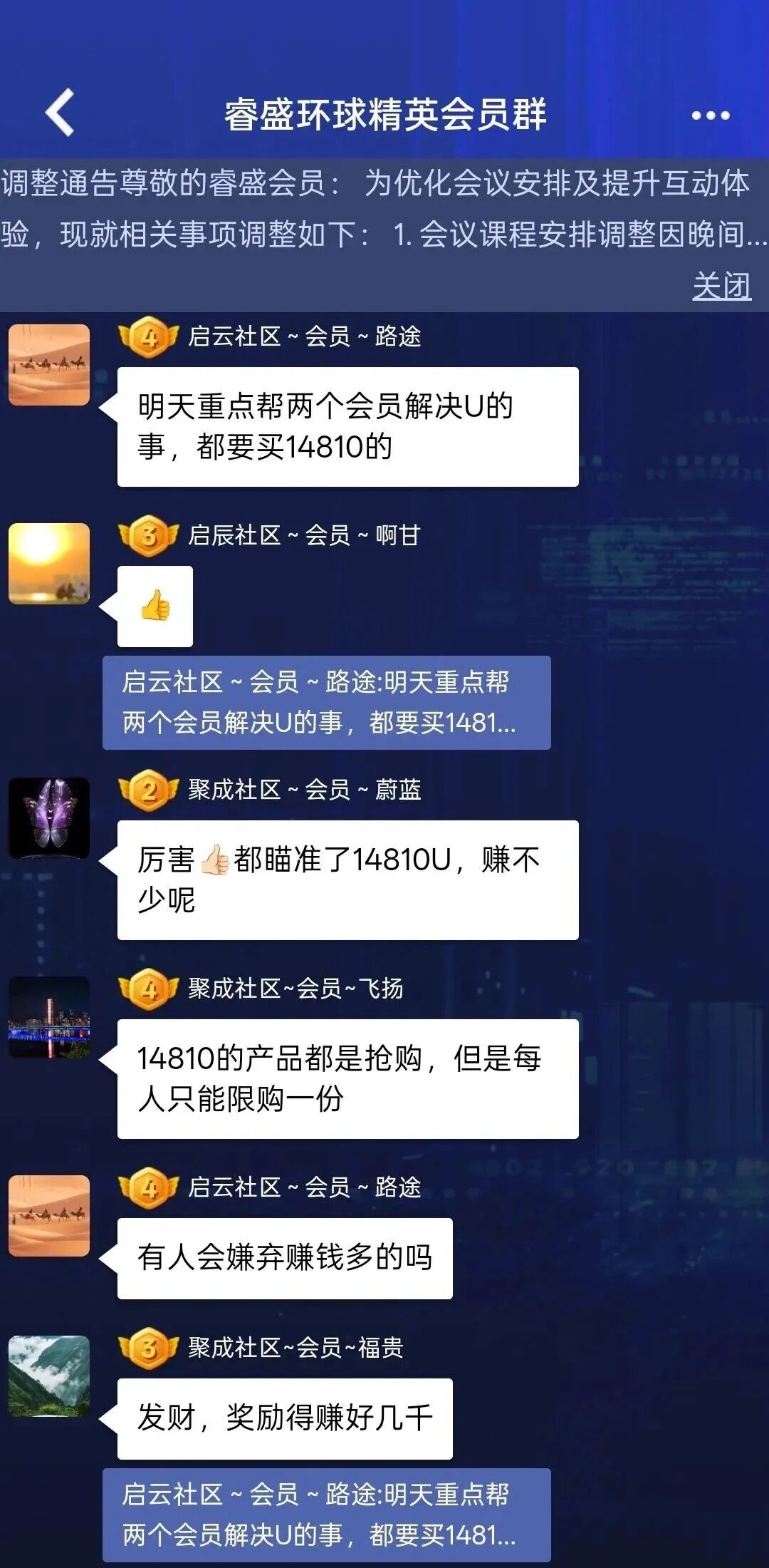 关于Golden Link睿盛环球的项目社群状态,都是通过自身内部APP聊天系统,群里80%都是项目托儿,营造该项目多赚钱,自己通过努力买车、买房、拉人头走上人生顶峰,定期还有项目方发USDT美金,都是羊毛出在羊身上,你想撸项目方羊毛,毫无疑问最后基本结局都是被诈骗团伙扒个精光。