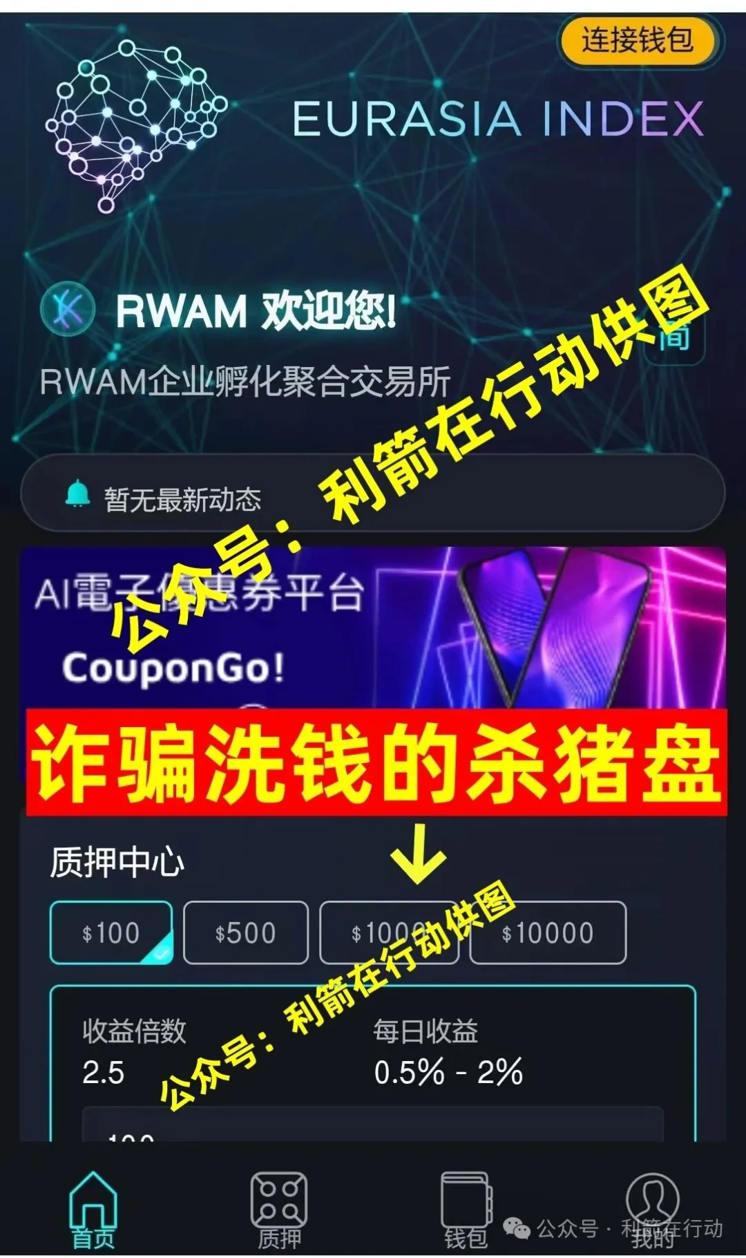RWAM交易所也是宣传的很高大上,牛皮的不要不要的,仔细一看质押中心,投资金额从100、500、1000、10000美金·,收益越来越高,时间越拉越长的特点上看出,这是妥妥的杀猪盘套路,目的就是小金额“养猪”,大金额“杀猪”。