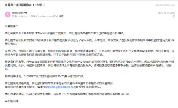 A某表示,交易过程中,发现这期间黄金波动很大,冒着爆仓的风险盈利2715美金,盈利后,A某就在10月29号申请出金。但是这笔出金未到,并等来了澳福平台的邮件,邮件内容称A某是因为“违规交易”,所以需要扣除盈利,于是扣除了。只能出本金。A某表示不理解,具体违反哪条。希望平台重新核查清楚并归还其盈利。