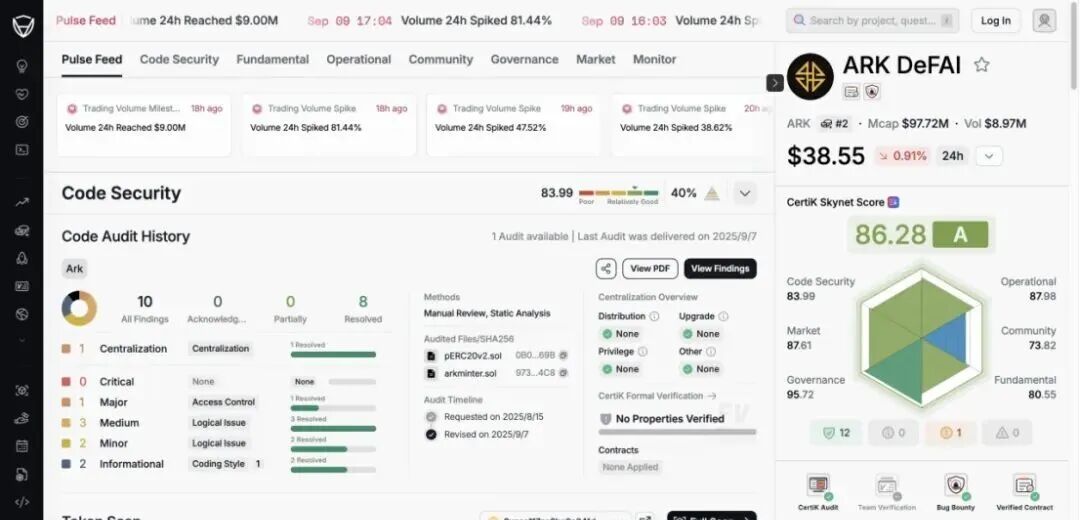ARK 的宣传里,整天大喊“全链审计通过”,听到这话不少人还以为他们上的智能合约都被查遍了。可事实是,CertiK 只验证了两份合约(TransparentUpgradeableProxy + ARK token),并没有包括资金池、治理合约、代理权限类合约。而 Cyberscope 扫描结果还表明这些合约仍是可升级、有权限控制的状态,说明审计并没有真正封锁后门,
