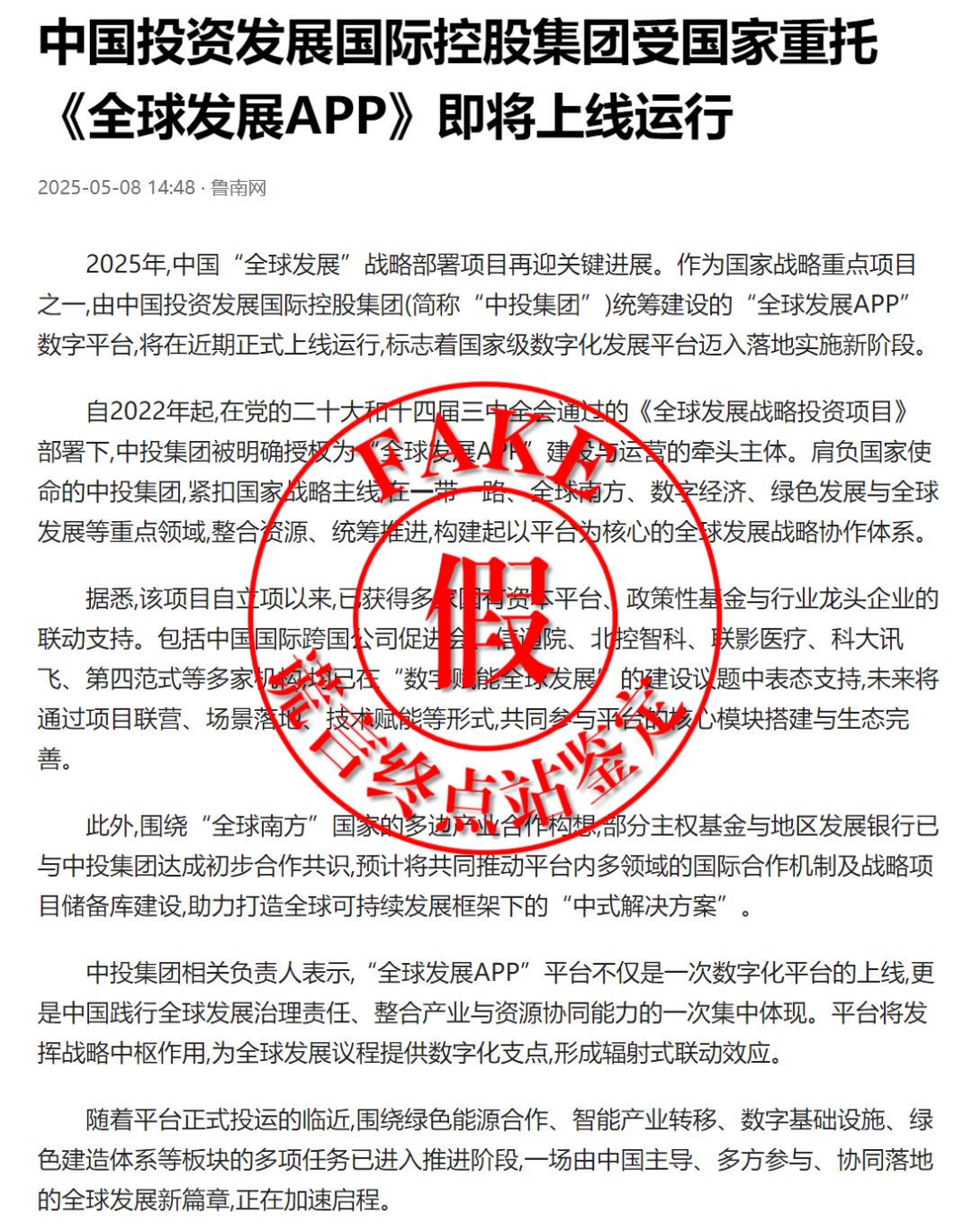 近期发现,中国投资发展国际控股有限公司(注册地为香港),冒称国家国际发展合作署(以下简称“我署”)主管企业,在互联网和微信公众号发布宣称与我署存在关联关系的虚假信息,冒用我署直属事业单位注册标识,并可能存在假冒我署名义开展不法活动的情形。