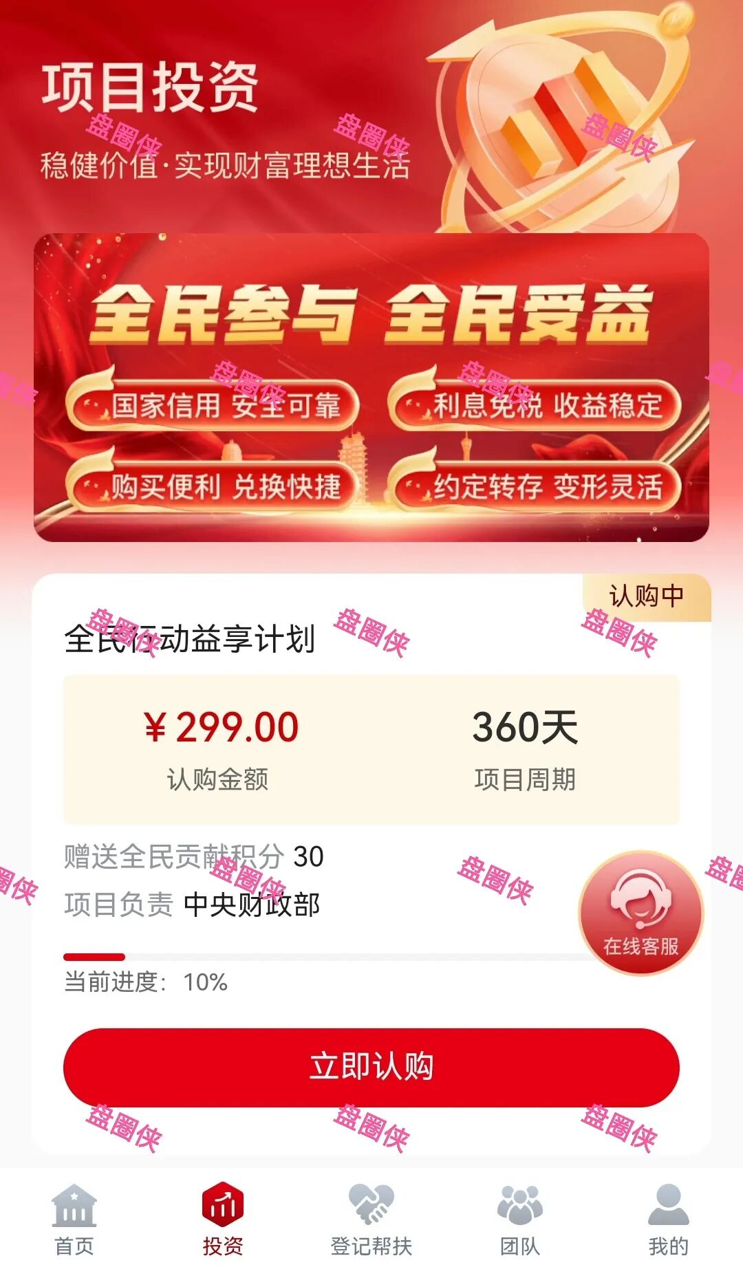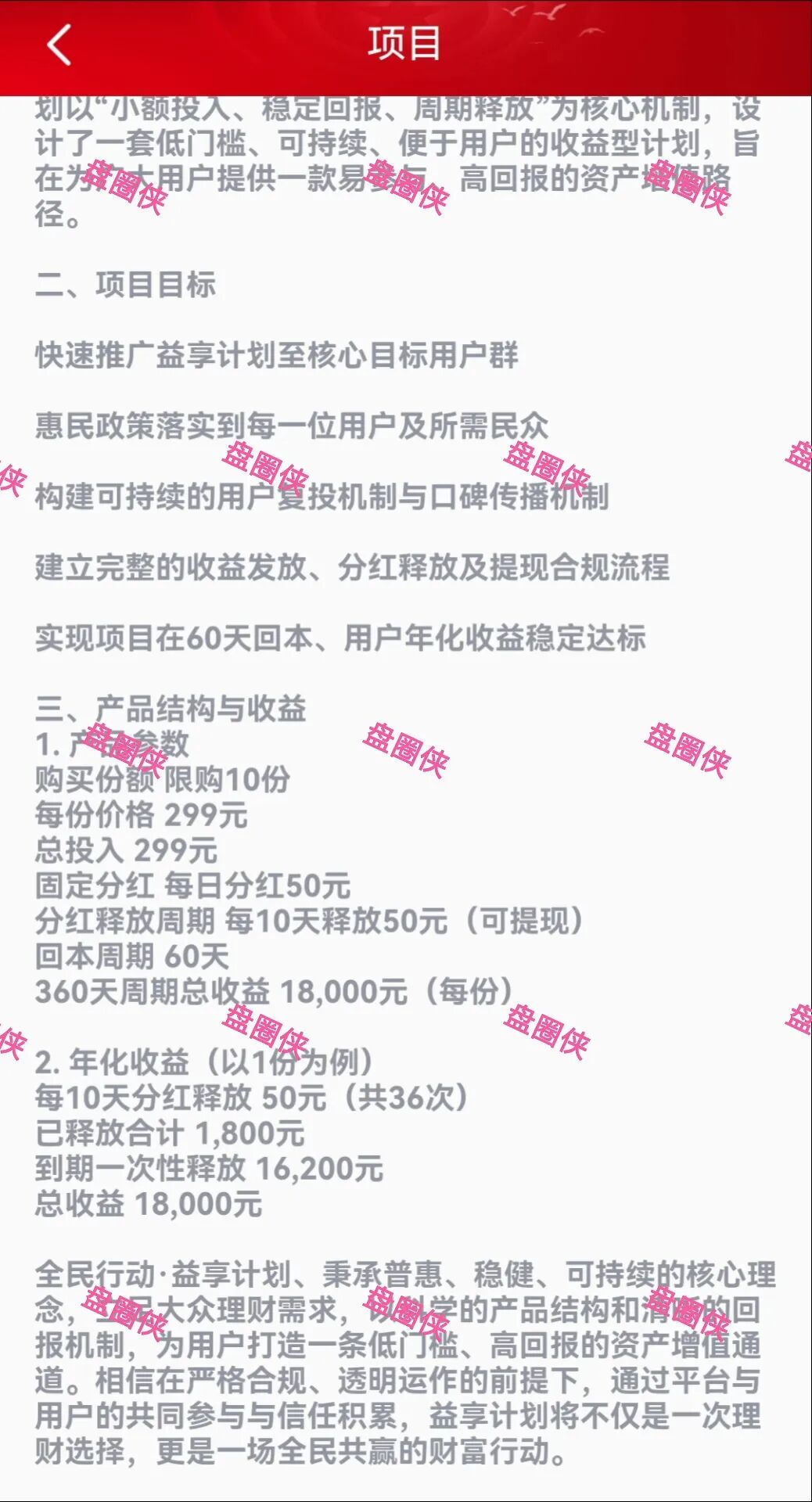 目前仅上线一款299元的产品,每10天释放50元,周期360天,在到期后一次性释放16200元,享3级收益,1级10%,2级3%,3级2%。