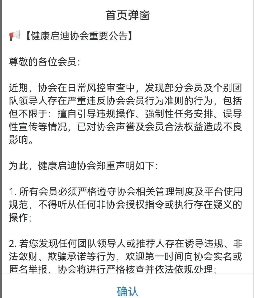发的公告说是用户违法了行为准则,还冒充健康启迪协会的名义发公告,目前官方群都被解散了,一些团队领导人也都消失了,众多投资者纷纷维权中。