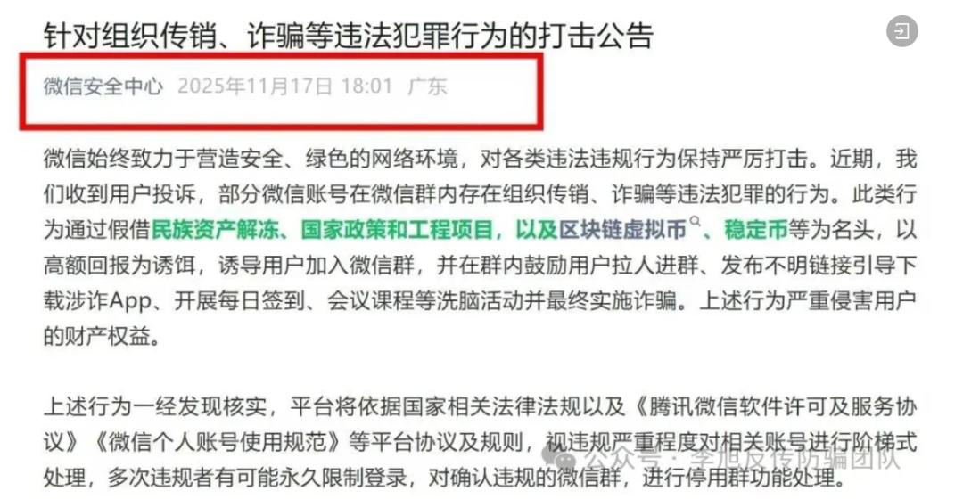 11月19日,微信安全中心发布公告,明确指出将开始清理和打击利用微信群进行的传销、诈骗行为。