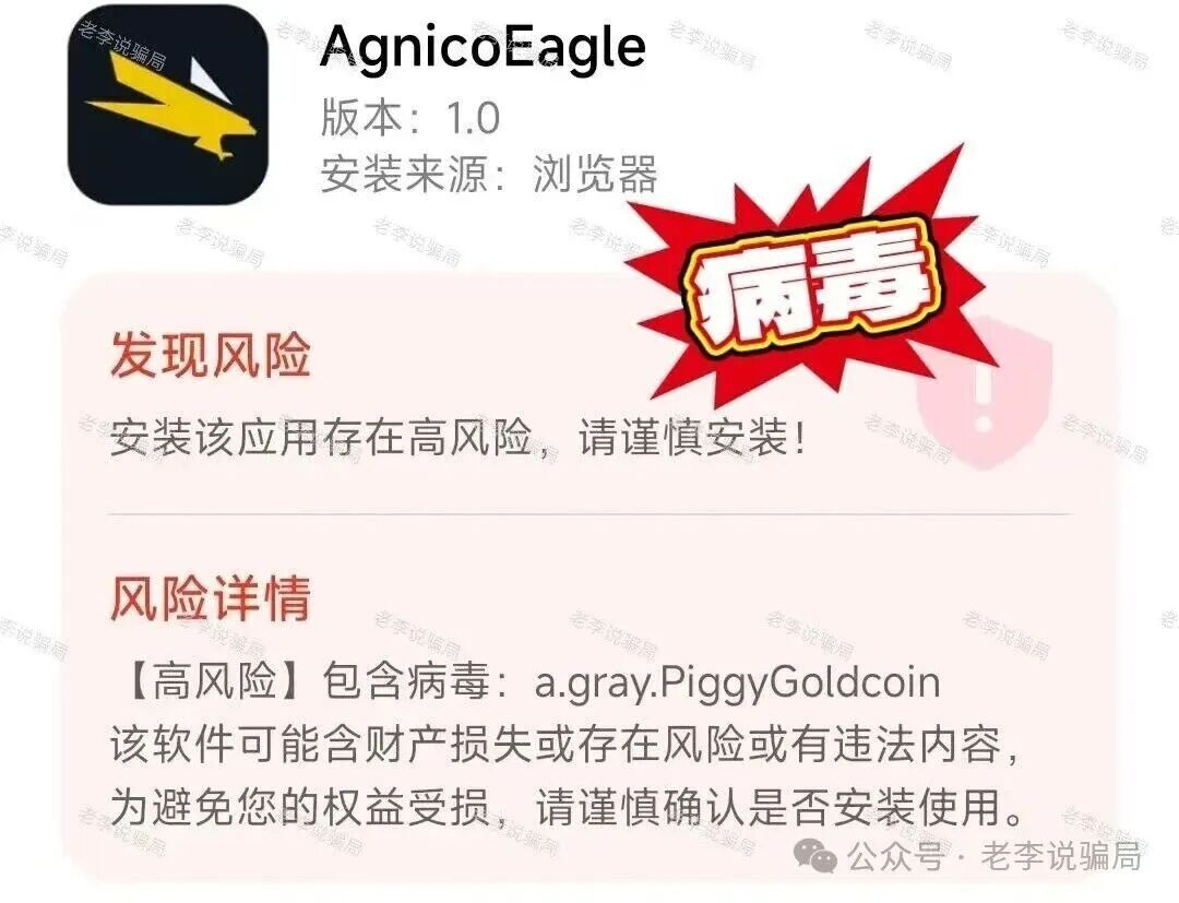 “Agnico Eagle” APP: 打着“AI量化资金托管”旗号,诱导参与者投资算力挖矿,兜售高息虚假投资理财产品。APP下载提示未备案且携带病毒。目前已无法提现。