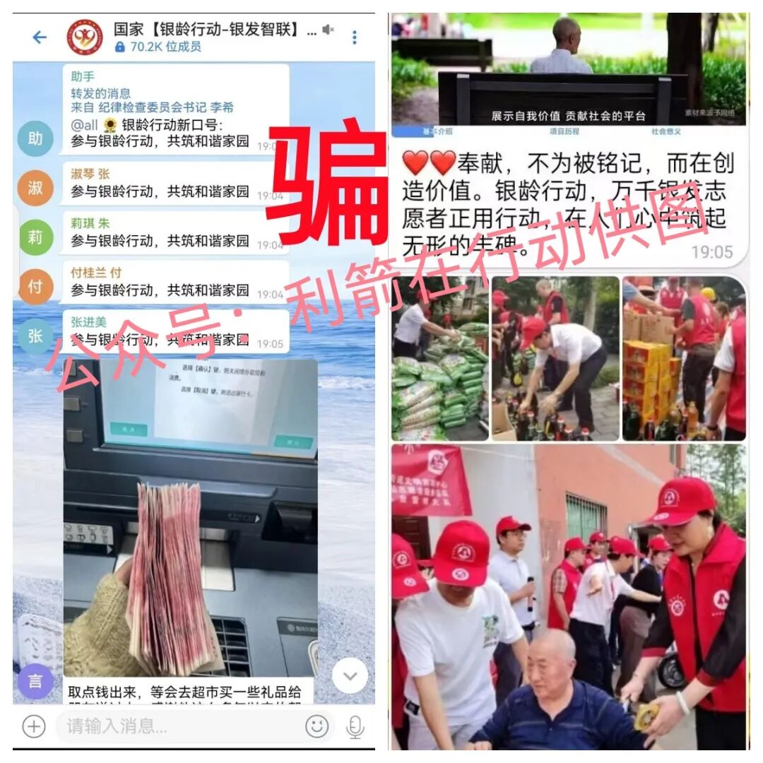 “银龄行动”是骗子“碰瓷”相关政策,专门为老年人量身定做的民族资产解冻类项目项目,骗子利用老年人“爱国、慈善、公益”的心理,忽悠一些参与的老年人做“慈善”公益活动发展下线,不明真相的老人在骗子的蛊惑下,积极从事这些活动,真应了那句“被人卖了还在帮人家数钱”,赶紧远离这个虚假项目吧!