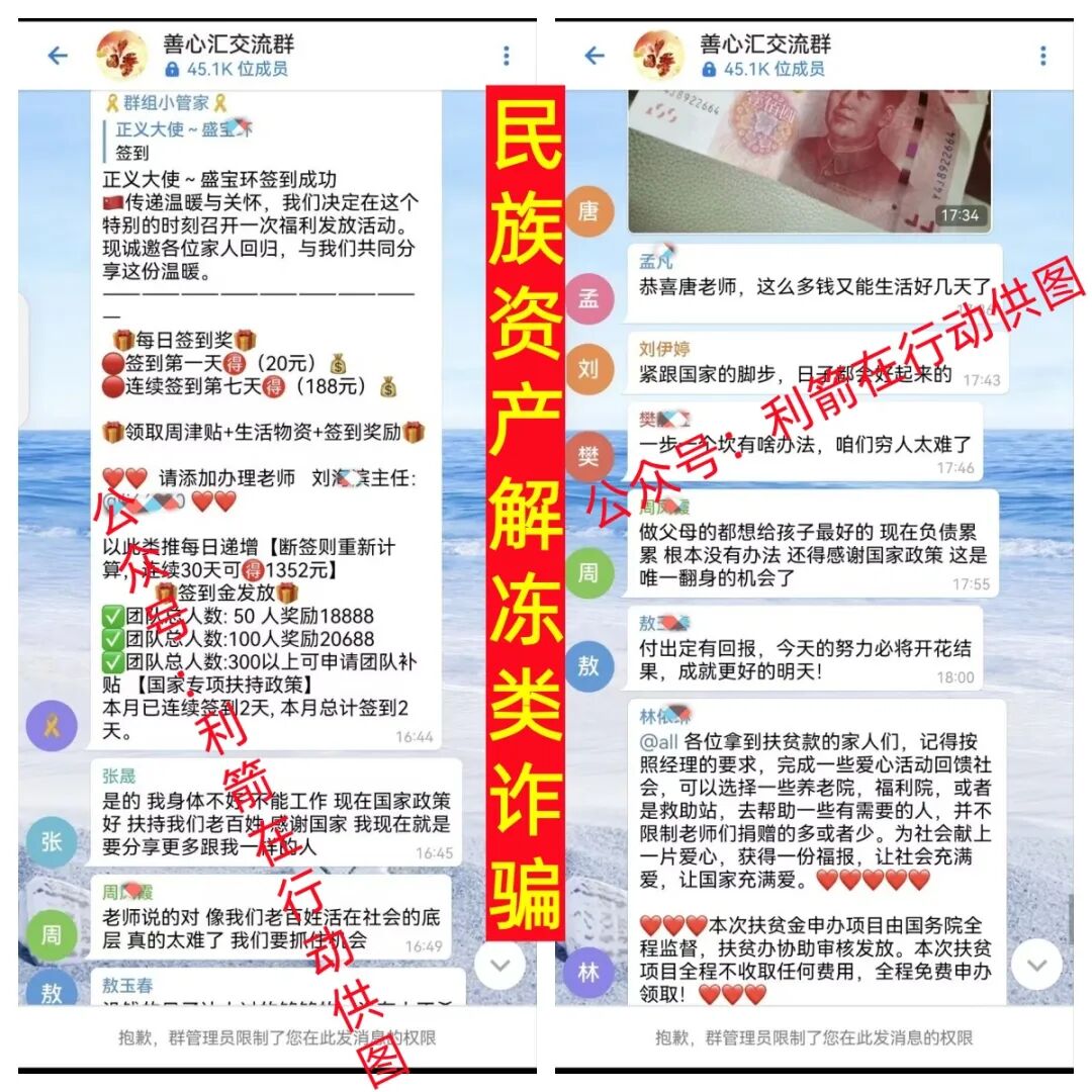 网络中有个假借“善心汇”旗号,谎称要给参与者发放"扶贫款",群里面还有人发拿到了“扶贫款”的视频,一些人在群里面跟着附和,殊不知这些都是骗子托儿演的双簧戏,当然也有一些不明真相的被骗人在群里面跟着起哄,利箭小编提醒,“善心汇”发“扶贫款”是非法收集参与者个人信息,是民族资产解冻类诈骗,别信,远离。