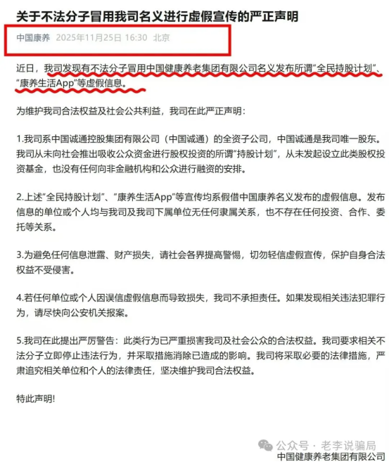最新动态:中国健康养老集团有限公司已于2025年11月25日发布严正声明,从未推出任何“全民持股计划”或“康养生活App”。所有相关宣传均为诈骗!