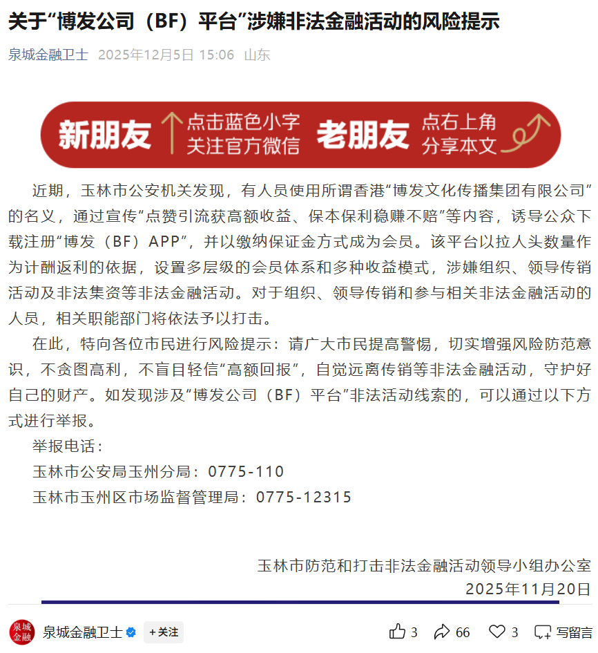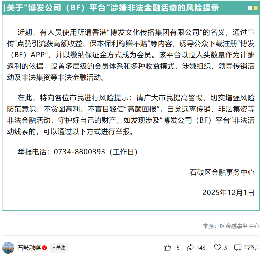 有不法分子冒用“香港博发文化传播集团有限公司”名义,通过宣传“点赞引流获高额收益”“保本保利、稳赚不赔”等内容,诱导公众下载注册“博发(BF)APP”,并以缴纳保证金方式发展会员。该平台以拉人头数量作为返利依据,设置多层级会员体系和多种收益模式,涉嫌组织、领导传销活动及非法集资等违法犯罪行为!