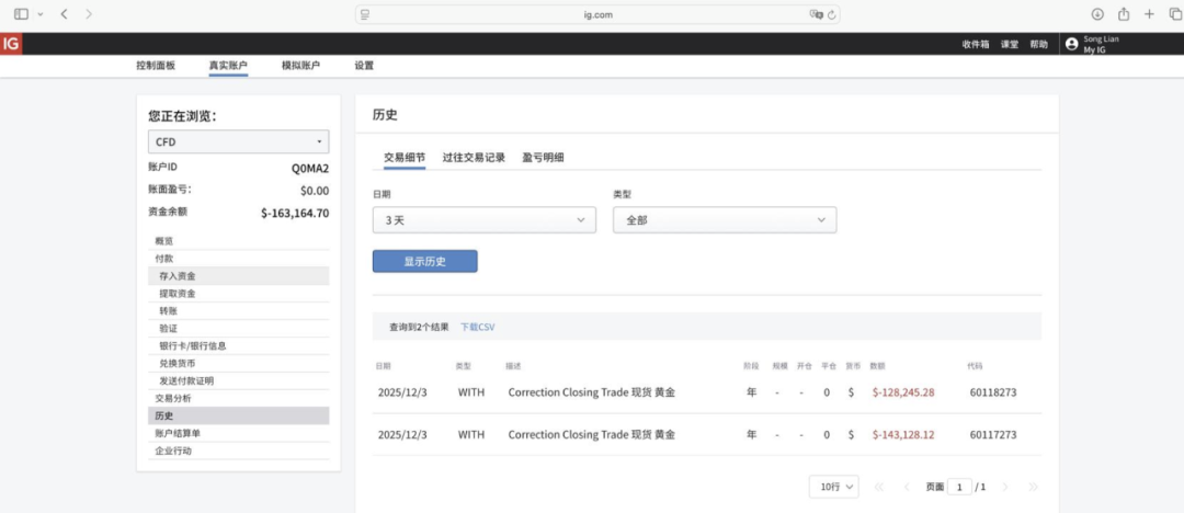 更令人震惊的是,仅数周后,即2025年12月3日,IG Group以违反《用户协议》及交易错误为由,对其账户资金进行了大幅扣除,高达271,373.4美元,使得账户余额出现负值,目前账户显示为-163,164.7美元。